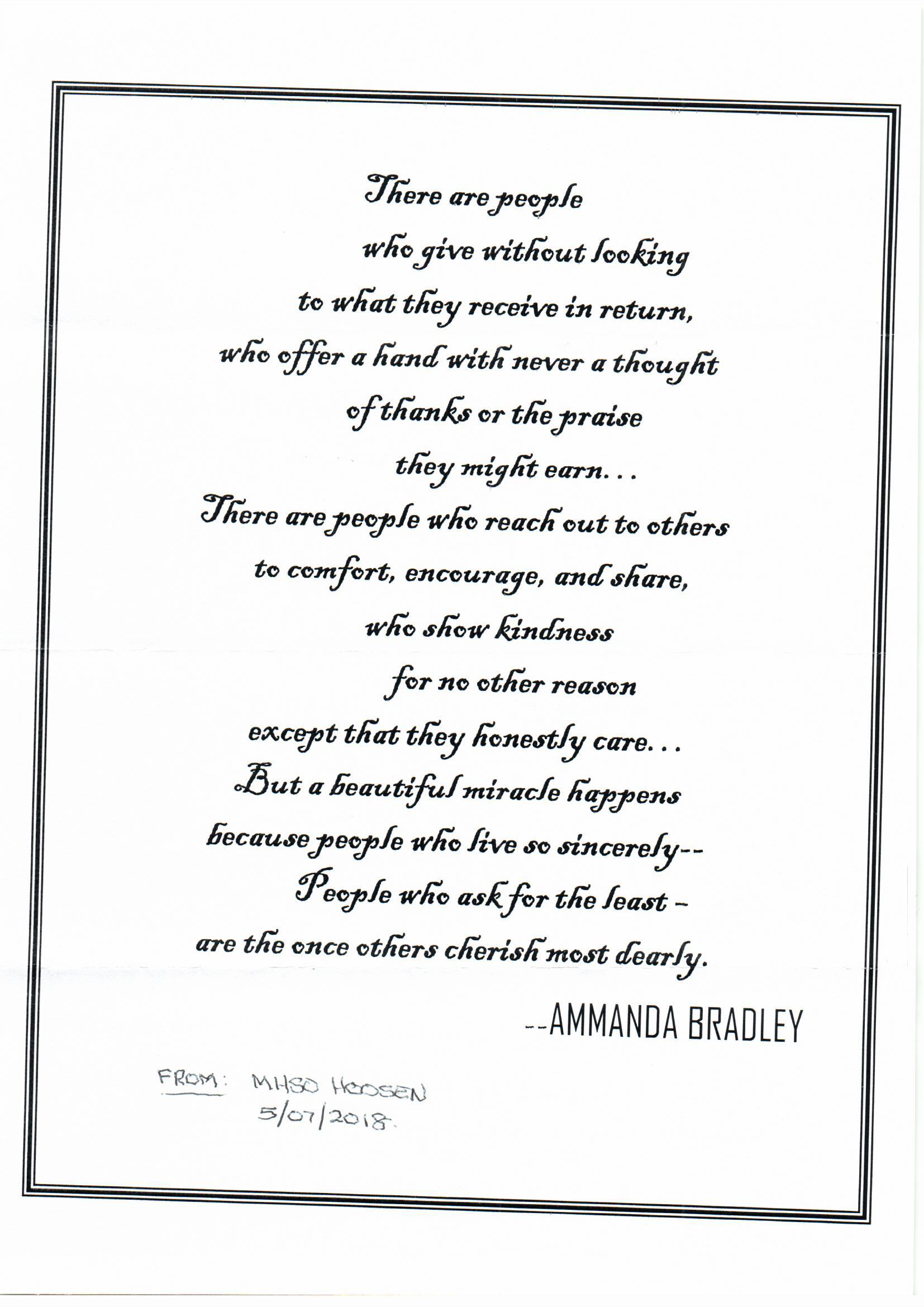 Marcia expressed to us the caring way in which you assisted them, grateful she could bring her son to you and at no cost to the appointment.